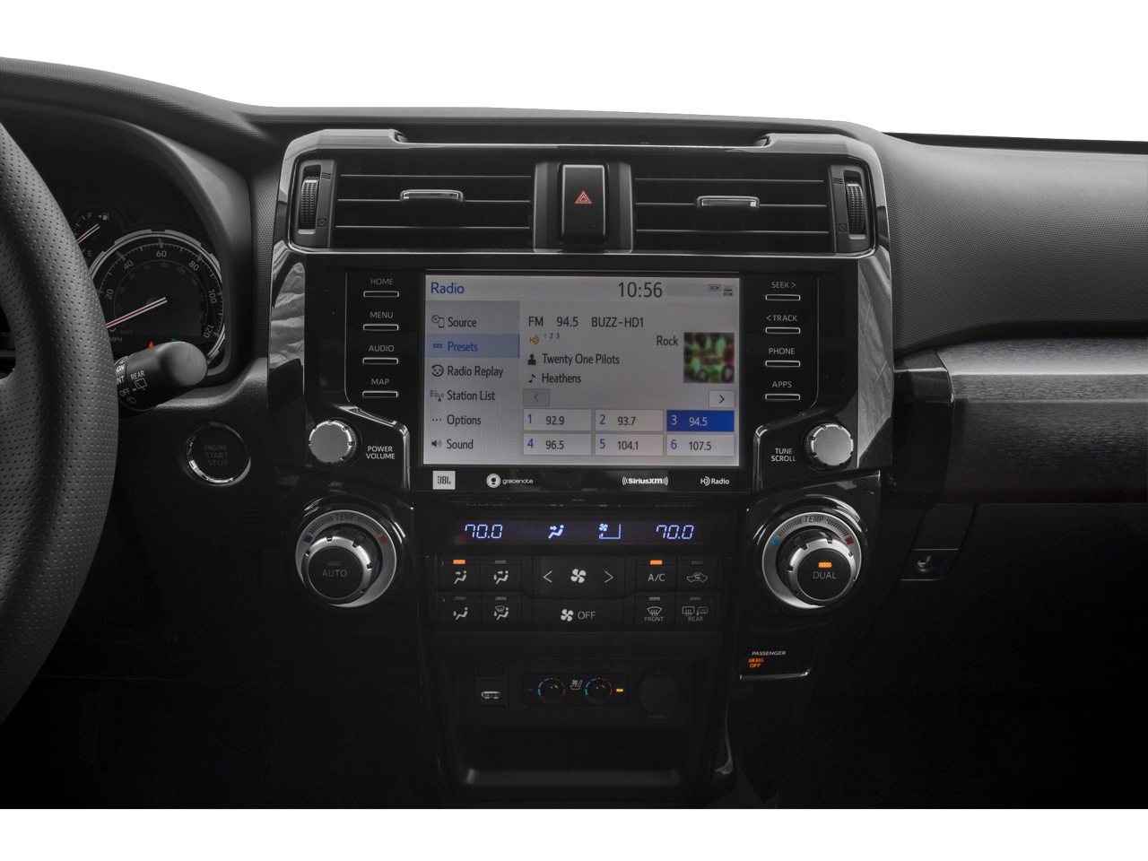 This vehicle comes equipped with: ABS brakes, Active Cruise Control, Alloy wheels, Compass, Electronic Stability Control, Front dual zone A/C, Heated door mirrors, Heated front seats, Heated/Ventilated Front Bucket Seats, Illuminated entry, Low tire pressure warning, Power moonroof, Remote keyless entry, Traction control, 15 Speakers, 3.727 Axle Ratio, 4-Wheel Disc Brakes, Air Conditioning, AM/FM radio: SiriusXM, Anti-whiplash front head restraints, Apple CarPlay/Android Auto, Auto High-beam Headlights, Auto-dimming Rear-View mirror, Automatic temperature control, Black Power Heated Mirrors, Black Roof Rails, Brake assist, Bumpers: body-color, Delay-off headlights, Driver door bin, Driver vanity mirror, Dual front impact airbags, Dual front side impact airbags, Emergency communication system: Safety Connect with 1-year trial, Exterior Parking Camera Rear, Front anti-roll bar, Front Bucket Seats, Front Center Armrest, Front fog lights, Front reading lights, Front wheel independent suspension, Fully automatic headlights, Garage Door Opener, Garage door transmitter: HomeLink, Knee airbag, Memory seat, Moonroof w/Tilt Up & Slide, Nightshade Leather Seat Trim, Occupant sensing airbag, Outside temperature display, Overhead airbag, Overhead console, Panic alarm, Passenger door bin, Passenger vanity mirror, Power door mirrors, Power driver seat, Power passenger seat, Power steering, Power windows, Radio: Premium JBL Audio w/Navigation, Rear anti-roll bar, Rear seat center armrest, Rear window defroster, Rear window wiper, Right & Left Individual Air Conditioner, Roof rack: rails only, Security system, Speed control, Speed-sensing steering, Split folding rear seat, Spoiler, Steering wheel mounted audio controls, Tachometer, Telescoping steering wheel, Tilt steering wheel, Trip computer, Turn signal indicator mirrors, Variably intermittent wipers, Ventilated front seats, and Wheels: 20 Black Alloy.