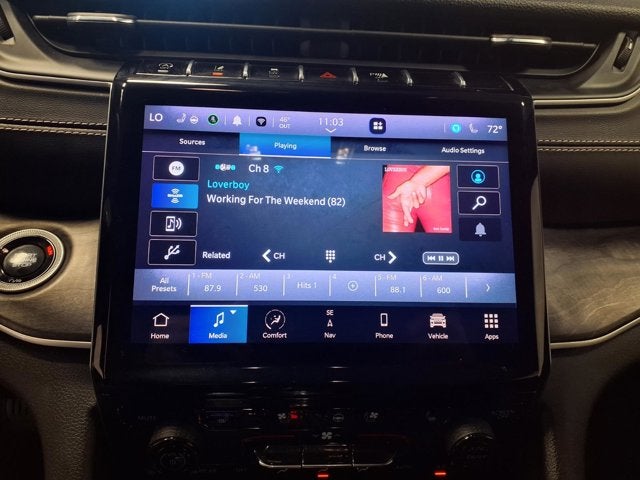 This vehicle comes equipped with: Luxury Tech Group II (2nd Row Manual Window Shades, Auto-Dimming Exterior Driver Mirror, Capri Leatherette w/Axis II Seats, Integrated Off-Road Camera, Intersection Collision Assist System, Memory Steering Column, ParkSense Front/Rear Park Assist w/Stop, Passive Entry - Front/Rear Doors, Liftgate, Power Tilt/Telescope Steering Column, Rain Sensitive Windshield Wipers, Rear Back Up Camera Washer, Rearview Autodim Digital Display Mirror, Surround View Camera System, Ventilated Front Seats, and Wireless Charging Pad), Quick Order Package 23E, 3.45 Rear Axle Ratio, 3rd row seats: split-bench, 4-Wheel Disc Brakes, 6 Speakers, ABS brakes, Active Noise Control System, Air Conditioning, Alloy wheels, AM/FM radio: SiriusXM with 360L, Anti-whiplash front head restraints, Audio memory, Auto High-beam Headlights, Automatic temperature control, Brake assist, Bumpers: body-color, Capri Leatherette Seats, Compass, Delay-off headlights, Driver door bin, Driver vanity mirror, Dual front impact airbags, Dual front side impact airbags, Dual-Pane Panoramic Sunroof, Electronic Stability Control, Emergency communication system, Four wheel independent suspension, Front anti-roll bar, Front Bucket Seats, Front Center Armrest w/Storage, Front dual zone A/C, Front fog lights, Front License Plate Bracket, Front reading lights, Fully automatic headlights, Garage door transmitter, Heated door mirrors, Heated front seats, Heated rear seats, Heated steering wheel, Illuminated entry, Interior Rear Facing Camera, Knee airbag, Low tire pressure warning, Manual Fold Seatbacks, Memory seat, Navigation System, Normal Duty Suspension, Occupant sensing airbag, Outside temperature display, Overhead airbag, Overhead console, Panic alarm, ParkView Rear Back-Up Camera, Passenger door bin, Passenger vanity mirror, Power door mirrors, Power driver seat, Power Liftgate, Power passenger seat, Power steering, Power windows, Radio data system, Radio: Uconnect 5 Nav w/10.1 Display, Rear air conditioning, Rear anti-roll bar, Rear reading lights, Rear window defroster, Rear window wiper, Reclining 3rd row seat, Remote keyless entry, Security system, Speed control, Speed-Sensitive Wipers, Split folding rear seat, Spoiler, Steering wheel mounted audio controls, Tachometer, Telescoping steering wheel, Tilt steering wheel, Traction control, Trip computer, Turn signal indicator mirrors, Variably intermittent wipers, Voltmeter, and Wheels: 18 x 8.0 Polished/Painted Aluminum.