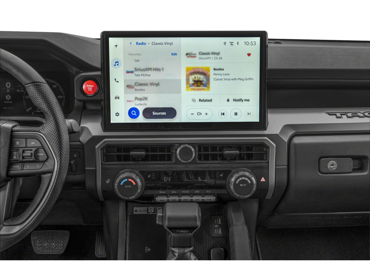 This Vehicle is nicely equipped with the following features: 4WD, 3.583 Axle Ratio, 4-Wheel Disc Brakes, 6 Speakers, ABS brakes, Air Conditioning, Alloy wheels, AM/FM radio: SiriusXM, Anti-whiplash front head restraints, Apple CarPlay/Android Auto, Auto High-beam Headlights, Auto-dimming Rear-View mirror, Automatic temperature control, Brake assist, Bumpers: body-color, Driver door bin, Driver vanity mirror, Dual front impact airbags, Dual front side impact airbags, Electronic Stability Control, Emergency communication system: Safety Connect (1-year trial), Exterior Parking Camera Rear, Fabric Seat Trim (FD), Four wheel independent suspension, Front anti-roll bar, Front Bucket Seats, Front Center Armrest, Front fog lights, Front reading lights, Fully automatic headlights, Heated door mirrors, Illuminated entry, Knee airbag, Leather Shift Knob, Leather steering wheel, Low tire pressure warning, Occupant sensing airbag, Outside temperature display, Overhead airbag, Overhead console, Panic alarm, Passenger door bin, Passenger vanity mirror, Power door mirrors, Power steering, Power windows, Radio: 8" Toyota Audio Multimedia, Rear step bumper, Rear window defroster, Remote keyless entry, Security system, Speed control, Speed-sensing steering, Split folding rear seat, Steering wheel mounted audio controls, Tachometer, Telescoping steering wheel, Tilt steering wheel, Traction control, Trip computer, Turn signal indicator mirrors, Variably intermittent wipers, and Wheels: 17" TRD Off-Road Alloy.