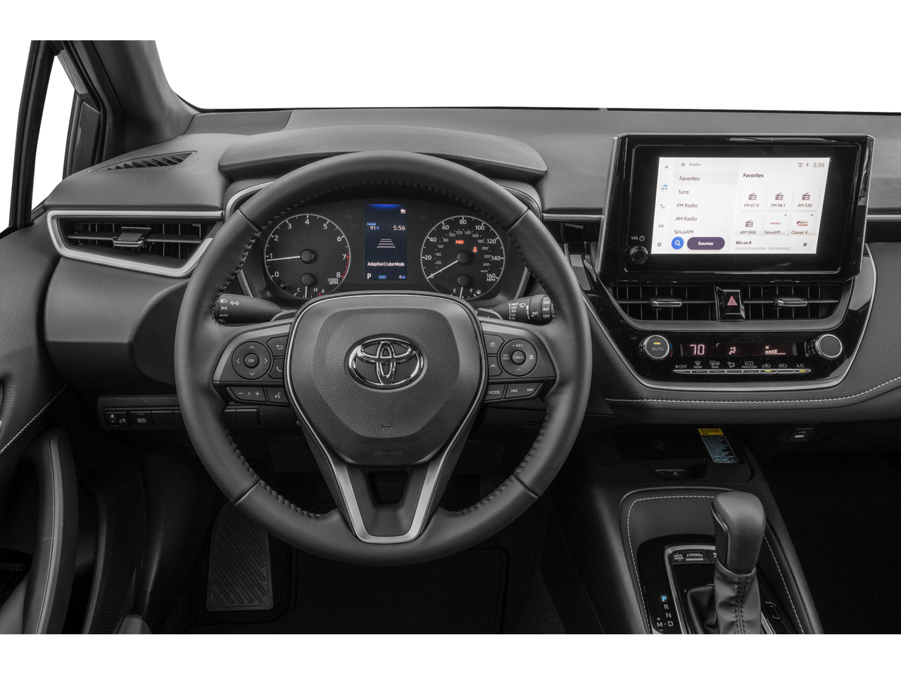 This Vehicle is nicely equipped with the following features: 4-Wheel Disc Brakes, 6 Speakers, ABS brakes, Air Conditioning, Alloy wheels, AM/FM radio: SiriusXM, Auto High-beam Headlights, Automatic temperature control, Brake assist, Bumpers: body-color, Compass, Delay-off headlights, Driver door bin, Driver vanity mirror, Dual front impact airbags, Dual front side impact airbags, Electronic Stability Control, Emergency communication system: Safety Connect (up to 10-year trial subscription), Exterior Parking Camera Rear, Fabric Seat Trim, Four wheel independent suspension, Front anti-roll bar, Front Bucket Seats, Front Center Armrest, Front reading lights, Heated door mirrors, Illuminated entry, Knee airbag, Leather Shift Knob, Leather steering wheel, Low tire pressure warning, Occupant sensing airbag, Outside temperature display, Overhead airbag, Overhead console, Panic alarm, Passenger door bin, Passenger vanity mirror, Power door mirrors, Power steering, Power windows, Radio data system, Radio: 8 Toyota Audio Multimedia, Rear anti-roll bar, Rear seat center armrest, Rear side impact airbag, Rear window defroster, Rear window wiper, Remote keyless entry, Security system, Speed control, Speed-sensing steering, Split folding rear seat, Spoiler, Sport Front Seats, Steering wheel mounted audio controls, Tachometer, Telescoping steering wheel, Tilt steering wheel, Traction control, Trip computer, Turn signal indicator mirrors, and Variably intermittent wipers.
